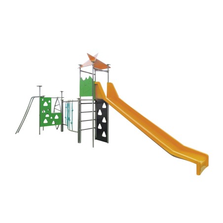 Le jeu pour enfants Moogli est constitué d’une structure en inox. Cette dernière est équipée de tubes de 60 x 60 mm, et d’un diamètre de 40 mm. Sa glissière est en polyester et son pont en cordes est composé de polypropylène.