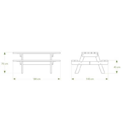 Cette table est constituée d’un dossier et d’une assise, eux-mêmes composés de lattes de section 5 x 12 renforcées. Ses pieds sont rallongés, afin de permettre un scellement dans un massif béton.