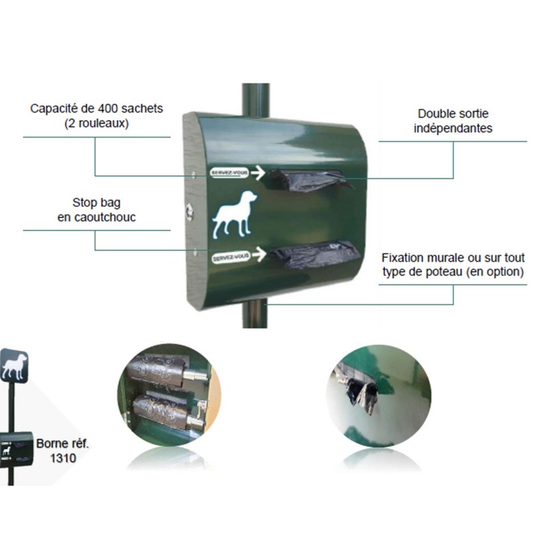 Le distributeur double rouleau pour déjections canines, offre un prélèvement unitaire et équipé d'un système "stop-bag". Il peut être fixé sur un mur ou sur un poteau. Simple à recharger grâce à un accès sur toute la façade.