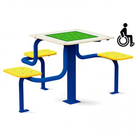 La table de jeu extérieure 3 en ligne PMR, une solution inclusive conçue spécialement pour les aires de jeu des collectivités. Cette table offre trois places assises ainsi qu'un emplacement prévu pour accueillir un fauteuil roulant. Conforme aux normes de sécurité EN 1176.