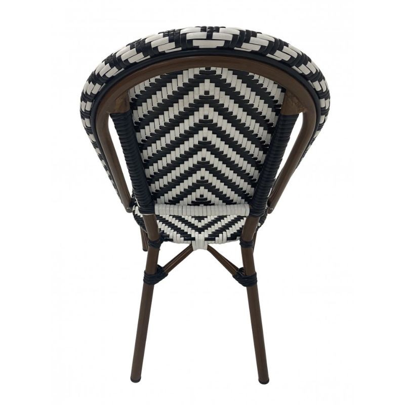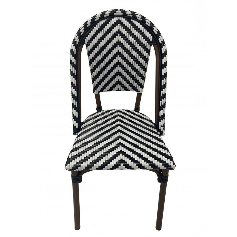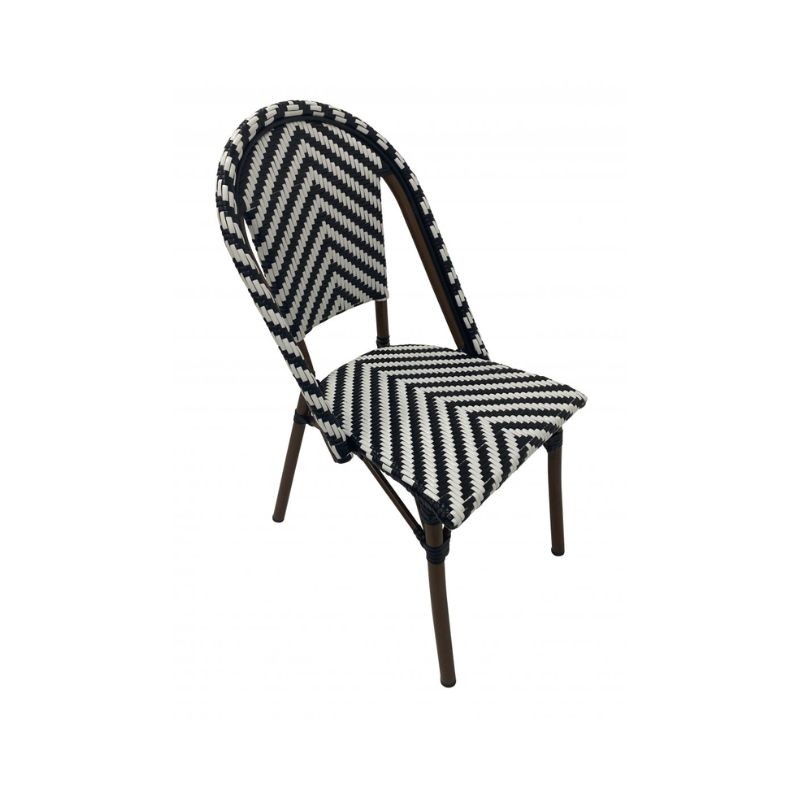 La chaise bistrot empilable à motif chevrons se compose d'une structure en aluminium effet bambou supportant une assise et un dossier en rotin synthétique tressé. Robuste et légère, elle est conçue pour une utilisation extérieure en terrasse de café, restaurant ou glacier. Son motif noir et blanc apporte une touche graphique tout en conservant l’esprit bistrot. Empilable jusqu’à 10 pièces, elle convient à un usage professionnel intensif en extérieur.