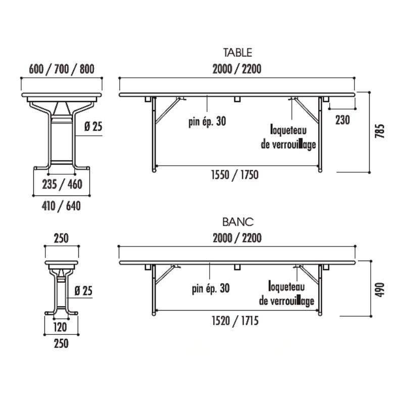 Encombrement plié : 75 mm (tables et bancs)